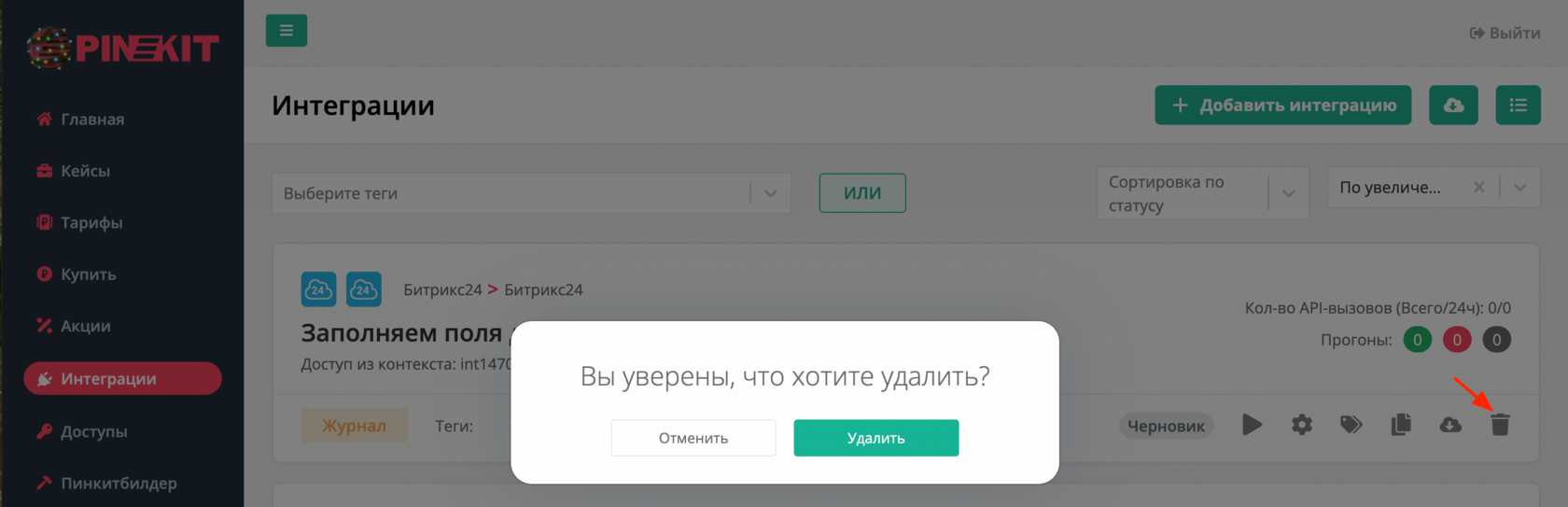 - При удалении интеграция скрывается из интерфейса, но остаётся сохранённой в базе данных.