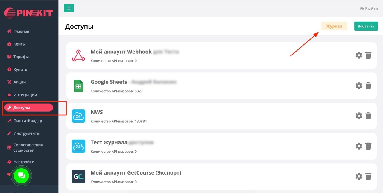 Доступы к сервисам можно добавить в разделе "Доступы" личного кабинета Пинкит, чтобы далее настраивать интеграции с этими сервисами под свои сценарии.