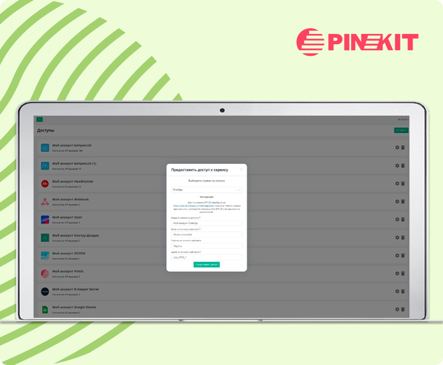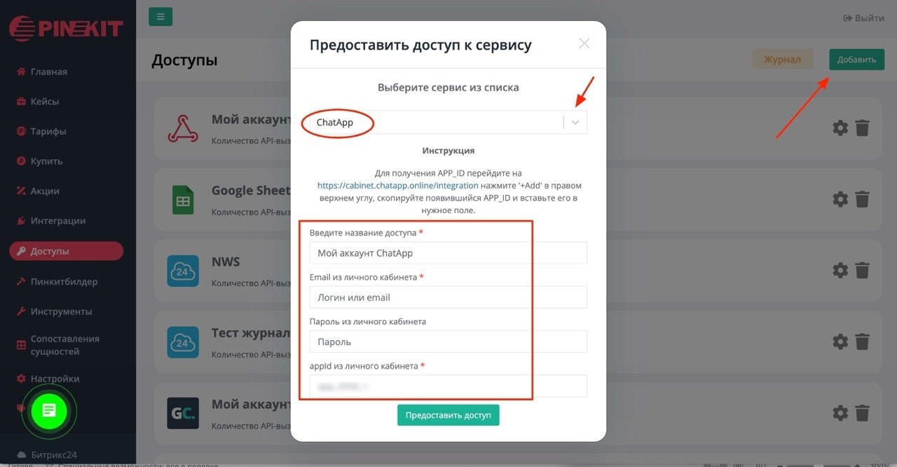 В разделе "Доступы" теперь можно добавить авторизацию для агрегатора мессенджеров ChatApp:
